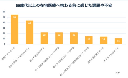 - 「診療スキル」「患者家族への対応」への不安:年代を問わず、訪問診療を始める前には「診療スキル」や「患者・家族への対応」に最も大きな不安を感じている。