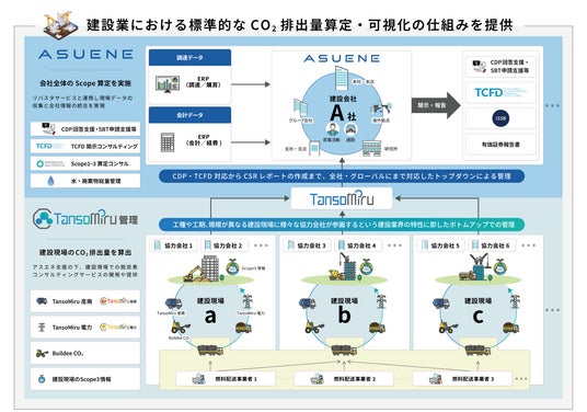 このたびの提携により、当社が提供する、建設業界に特化したCO2排出量の算出・可視化クラウドサービス「TansoMiru(タンソミル)」で管理する建設現場単位のCO2排出量データを、アスエネ提供の「ASUENE(アスエネ)」に連携させることが可能になります。これにより、建設現場レベルから、グループ会社や海外拠点を含めたグループ全体におけるCO2排出量の一元管理だけでなく、ダッシュボードによる分析を通じてその実態をより精緻に把握できるようになります。当社とアスエネはCO2排出量の効率的な可視化を支援し、持続可能な社会の実現に貢献してまいります。