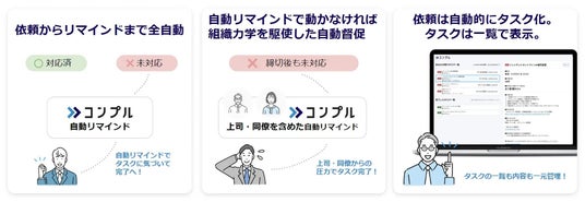 コンプルは他部署への催促や要請に苦手意識を持つ方々の業務をしっかりとサポートする心強いツールとなっています。