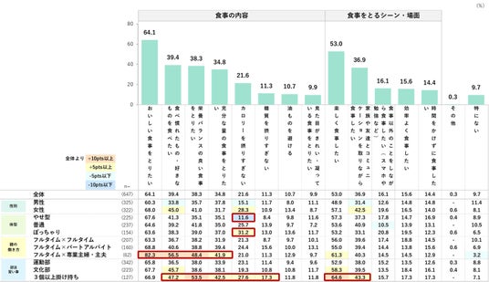 親が専業主婦・主夫の人、部活・習い事を3個以上掛け持ちしている人は、他の属性と比べて食への関心が高い傾向にある。体型別では、やせ型の人よりぽっちゃり体型の人のほうが「カロリーを摂りすぎない」ことを気にしている。