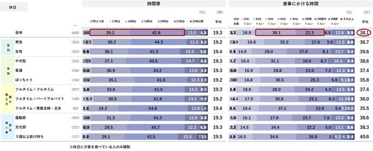 続いて休日は何時ごろに夕食を食べているか確認したところ、平日と同じくボリュームゾーンは「19時台」「18時台」。食事にかける時間は、 30~40分がボリュームゾーンで平均38.1分と平日よりやや長め。