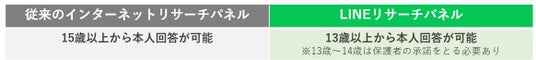 LINEリサーチの特徴の一つとして、13歳から本人回答が可能である点が挙げられます。従来のインターネットリサーチパネルでの本人回答は15歳以上から可能となっており、14歳以下に聴取したい場合は保護者の代理回答が必須となります。また、15歳以上から可能ではあるものの、登録者数が少ないため、結果的に保護者の代理回答を余儀なくされることもあります。それに対し、LINEリサーチの本人回答は13歳から可能となっており(※) 、若年層のリアルな声を収集することができます。