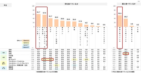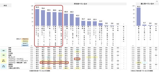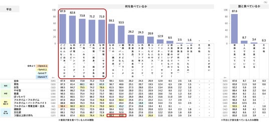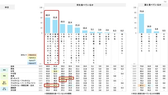 休日の夕食に何を食べているか確認したところ、平日と同じく、ごはん+おかず+汁物のメニューが上位に挙がる。「外食」は42.2%で平日よりも割合が高く、特に共働き家庭では全体より5pts以上高め。平日のほうが夕食を準備する時間がなく外食の利用頻度が高くなるかと推測したが、平日はなるべく自炊をし、休日はゆっくりと外食をするなどメリハリをつけている家庭が多いのかもしれない。平日と同様、「家族と食べている」の選択率が高め。