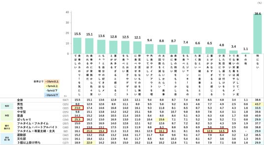 食事に関して親には言えない本音を聞いてみたところ、「食事のカロリーを気にしてほしい」が15.5%で、特に女性とぽっちゃり体型の人で高め。当初は、やせ型の人のほうがカロリーを気にしたり、食事の回数を減らしたりと日常的に食事に対して気を遣っているのではないかと仮定していたが、実際にはぽっちゃり体型の人のほうが“現在の体型を変えたい”という意識が働くからか、カロリーや食事量に対して積極的に意見を持つ傾向が見られた。親が専業主婦・主夫の人は5つの項目で全体より5pts以上高い。親が食事の準備に充てられる時間が多いと認識していることから、食事における要求水準が高くなると考えられる。