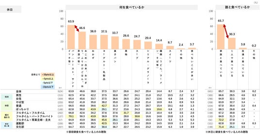 休日の昼食に何を食べているか確認したところ、「家で手作りのものを食べる-ご飯中心」が60.9%、次いで「家で手作りのものを食べる-麺類」が51.8%と続く。体型別では、ぽっちゃり体型の人が「外食」「コンビニやスーパーで買ったもの」といった、外食・中食の登場頻度が多い様子。親の働き方別で見ると、共働きの家庭の人は「外食」、専業主婦・主夫の家庭の人は「家で手作りのものを食べる」が全体に比べて高め。休日は「家族と食べている」の選択率が高い。