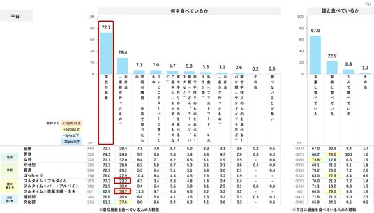 休日のメニューは、ぽっちゃり体型の人が「外食」「コンビニやスーパーで買ったもの」といった、外食・中食の登場頻度が多い様子。平日は学校があるため「友達と」、休日は「家族と」一緒に食べている選択率が高い。