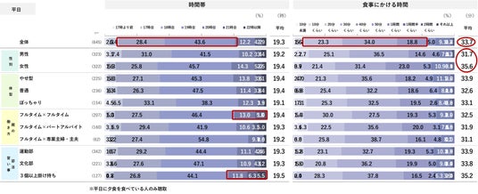 夕食をとる時間は、平日・休日共に「19時台」「18時台」がボリュームゾーン。親の働き方別では「共働き家庭」、部活・習い事別では「3個以上掛け持ち」が、他の属性と比べて20時以降の遅めの時間帯の割合が多くなる。食事にかける平均時間は平日「33.7分」休日「38.1分」と休日の方がやや長め。