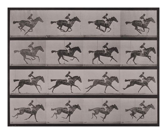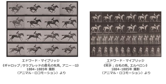 エドワード・マイブリッジ(1830-1904)は、今から約150年前、世界で初めて、走る馬の連続写真の撮影を成功させた人物です。映画や動画、アニメーションの先駆者として、視覚芸術の歴史において最も偉大な写真家の一人とされています。1872年、マイブリッジは、実業家で元カリフォルニア州知事のリーランド・スタンフォードから依頼されたことをきっかけに走る馬の撮影実験を始め、1877年、走っている馬が胴体の下に四肢すべてを折りたたみ宙に浮いている一瞬を撮影することに成功。1878年には、疾走する馬の12コマの連続写真の撮影も成功させ、欧米各国で大反響を呼びました。また、1879年には一連の写真を連続的に投映する「ズープラクシスコープ」という装置を発明し、これがトーマス・エジソンに影響を与え、1889年の映写機械「キネトスコープ」の発明につながったとも言われています。