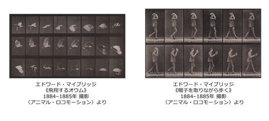 マイブリッジの『アニマル・ロコモーション(動物の運動)』(1887年)は、動物や人間の動きを詳細に記録した連続写真781組が収められた全11巻におよぶポートフォリオ形式の写真集です。馬のさまざまな歩き方や、犬やラクダといった動物の動き、オウムなどの鳥類の飛翔、さらには人間の運動や日常的な動作まで、マイブリッジは取り憑かれたように連続写真の撮影に心血を注ぎ、写真でありとあらゆる運動の解析を行いました。写真によって動きを止め、その瞬間をつないで生み出されたマイブリッジの連続写真は、時代を超え、動画の原点として、現在も世界中のアニメーターの教科書となっています。