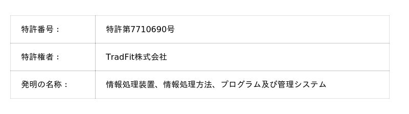 他にも多数の特許出願をしており、顧客バリューを基点に、強固な特許ポートフォリオを構築し、知財戦略でTradFitだけにしか提供できない独占領域を拡大し、事業の成長を最大化してまいります。