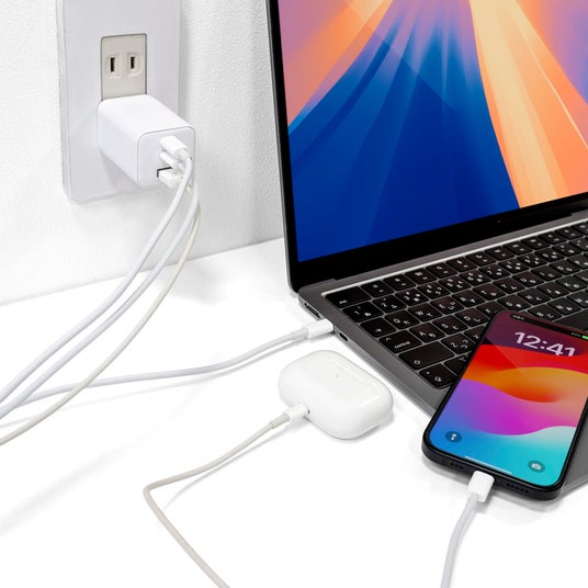 USB-Cポートを2つ、USB-Aポートを1つ搭載し、合計3台の機器へ同時に充電が可能です。スマートフォン、タブレット、ワイヤレスイヤホンといったモバイル機器からノートパソコンまで、幅広いデバイスに対応します。