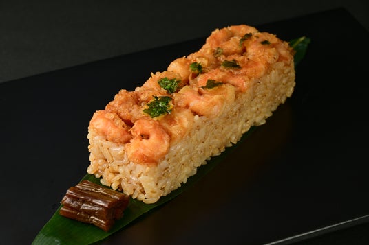 海老天押し寿司海老と大葉のかき揚げを「秘伝の丼たれ」で味付けし、押し寿司風に仕上げた一品。お土産にも丁度よい4切れ入り。天丼×お寿司の新感覚を是非お楽しみください。