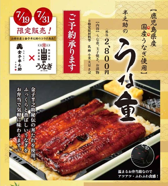 半之助のうな重無薬養殖に拘った鹿児島県産国産うなぎを、もっとも美味しく仕上がる「4度焼き」で香ばしく焼き上げ、控えめな甘さとさっぱりとした旨味が特徴の金子半之助秘伝の丼たれを合わせた土用の丑の日限定の一品。