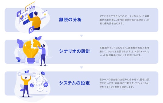 本サービスは、CEOの多紀澤が18年以上にわたる医療マーケティングの経験から、独自の成果創出メソッドを確立。離脱原因の分析からシナリオ設計、クリエイティブ制作、改善まで、一貫したPDCAサイクルを実行します。