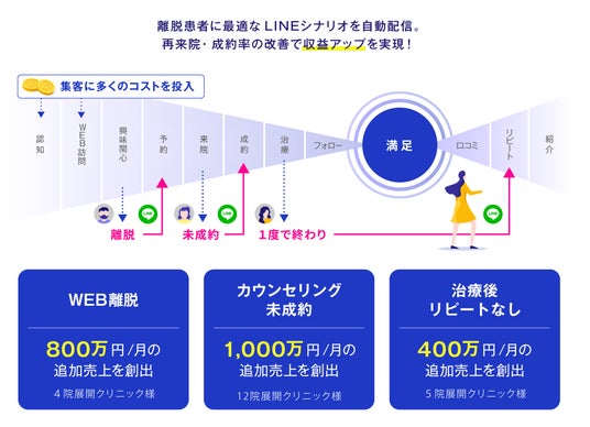 本サービスは、新規患者獲得が減少傾向にある中、既存患者の再来院やリピートを促進することで、クリニックの売上最大化を支援する日本初のサービスです。LINEを活用した個別最適化されたアプローチにより、患者とのエンゲージメントを強化し、取りこぼし患者を収益に変える新しいマーケティング手法を提供します。