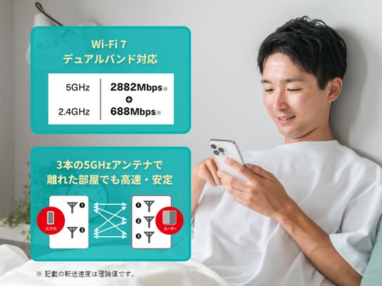 最新規格「Wi-Fi 7」に対応し、2つの周波数帯(5GHz/2.4GHz)を利用できるデュアルバンドルーターです。