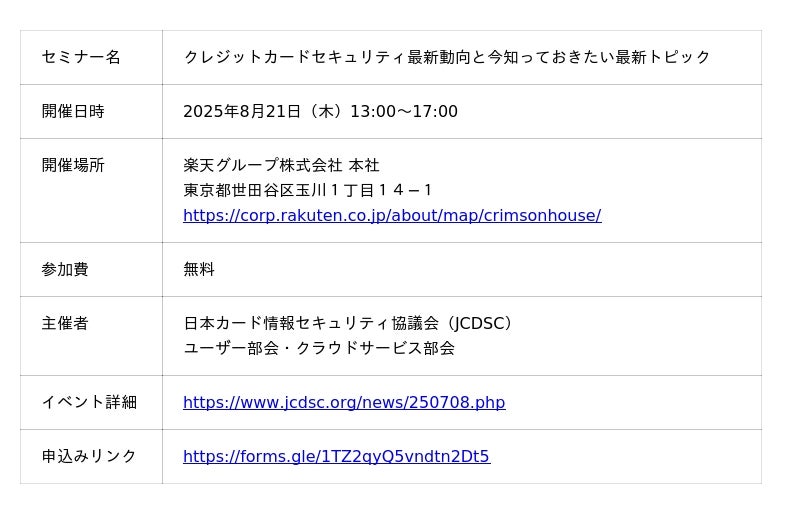 株式会社YTGATE(本社:東京都中央区、代表取締役:高橋祐太郎、以下「YTGATE」)は、2025年8月21日(木)、日本カード情報セキュリティ協議会(JCDSC)が主催するセミナー『クレジットカードセキュリティ最新動向と今知っておきたい最新トピック』に、代表・高橋が登壇することをお知らせいたします。