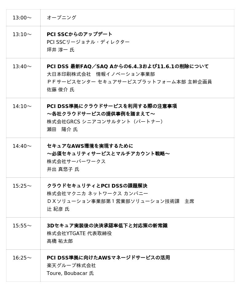 ※ 本セミナーは、「クレジットカードのセキュリティ対策」や「PCI DSS準拠」に取り組まれている、またはご関心をお持ちの事業者様・ご担当者様を主な対象としております。恐れ入りますが、主催者の判断により、対象外の方、または同業他社・競合企業にあたると判断される場合には、お申込みをお断りさせていただくことがございますので、あらかじめご了承ください。