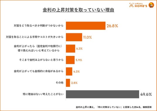 金利の上昇に備え、「特に対策はしていない」と回答した人に対しその理由を聞いたところ、最も多かったのが「特に理由はない/考えたことがない」(49.6%)、続いて「対策をどう取るべきか判断がつかないから」(26.8%)となりました。「そこまで金利は上がらないと思うから」(5.9%)、「金利が上がっても金銭的に余裕があるから」(4.3%)はいずれもごくわずかとなっており、金銭的な余裕がある訳でも楽観視している訳でもないものの、対策については考えられていないという状況がわかりました。