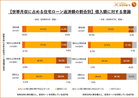 「3割以上」の割合が前回調査よりも増加。3割以上になると「もっと借入額を減らせばよかった」が「適切だった」を超える