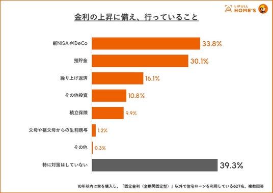 「固定金利(全期間固定型)」以外の住宅ローンを利用している購入者に対し、金利の上昇に備えて行っていることを聞いたところ、何かしら対策をしているのは60.7%となり、完済への不安はありつつも、対策を打てていない人が一定数いることがわかりました。最も多かった対策は「新NISAやiDeCo」(33.8%)、「預貯金」も3割いた一方で、「繰り上げ返済」は16.1%しかおらず、経済の不透明感が強まる中、現金を保有しておきたいという意向がうかがえました。