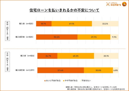 【住宅ローンを払いきれるかの不安について】不安を抱いているのは購入者69.9%に対し、検討者93.2%。前回調査よりも乖離広がる