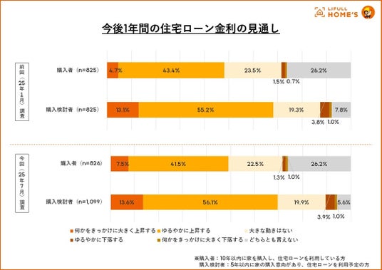 【今後1年間の住宅ローンの見通し】「上昇」の予測は購入者49.0%に対し、購入検討者69.7%、前回調査よりも乖離広がる