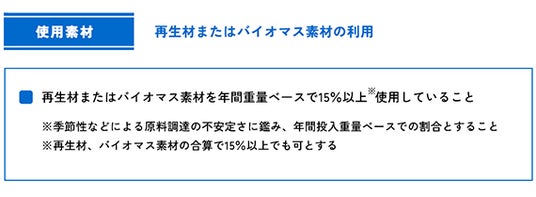 要求事項3・再生材またはバイオマス素材を年間重量ベースで15%以上使用していること