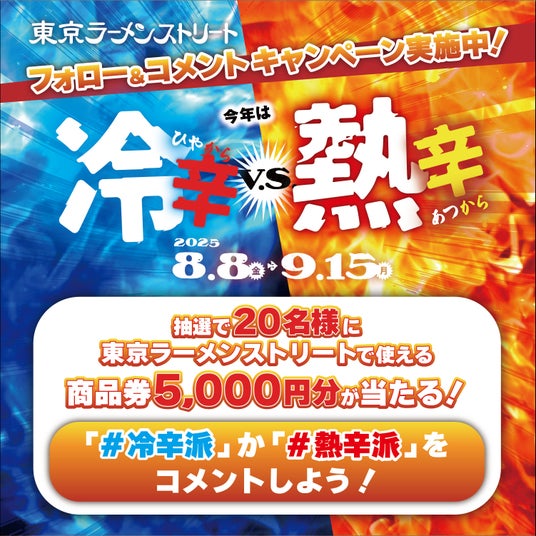 2025年8月8日(金)~9月15日(月・祝)の期間中、東京駅一番街公式Xアカウントをフォロー後、キャンペーン投稿に「#冷辛派」「#熱辛派」のハッシュタグをつけてコメントし、多数派となった方の中から抽選で20名様に「東京ラーメンストリートで使える商品券5千円分」をプレゼントします。