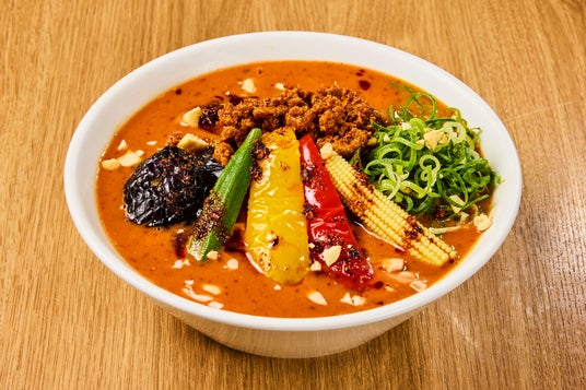 ひとつひとつ丁寧に仕込んだ具材が濃厚な担々スープに絡む、真夏にこそ食べたい渾身の“俺式担々麺”です。シナモンや山椒、八角を使用した自家製ラー油や、一味、豆板醤で味付けした特製旨辛挽肉の刺激が食欲をかき立て、ナス、赤・黄パプリカ、オクラ、ヤングコーンといった彩り豊かな夏野菜の甘みも楽しめます。〆にお好みでライスを加えると、最後の一滴まで美味しく味わえる一杯です。