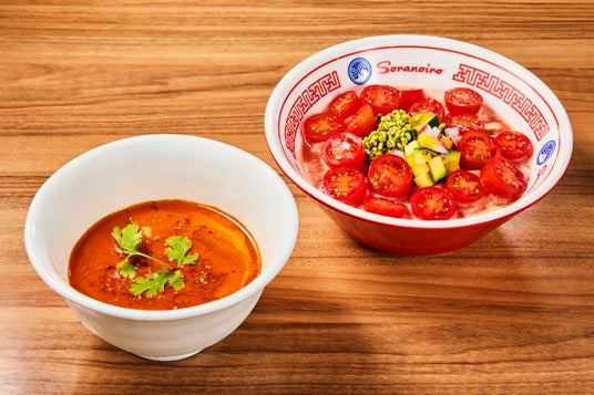 北海道遠別町・竹之内農園の糖度の高い“アイコトマト”を使用。まずは、「まぜそば」としてアイコトマトと濃厚なトマトピュレを使った特製ダレが、タピオカ粉を使用したモチモチ食感の麺によく絡み、甘味と旨みを感じるトマトの美味しさを存分に味わってください。次に、「つけそば」としてトムヤムクンペーストに山椒を効かせた特製ダレに麺をつけることで、辛さと痺れ、そしてトマトの甘味が広がる、2段階で楽しめクセになる一杯です。