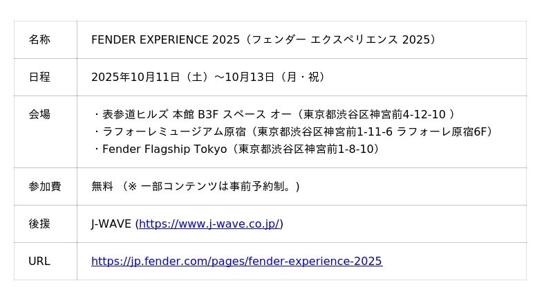 音楽・クリエイティビティ・そして人とのつながりを祝う体験型イベント【FENDER(R) EXPERIENCE 2025】が、2025年10月11日(土)~ 13日(月・祝)の3日間、原宿・表参道エリアで開催されます。フェンダーが独自に企画・キュレーションを手掛ける本イベントは、単なる展示会やライブイベントにとどまらず、音楽、そしてギター/ベースを愛するアーティスト、ファン、そしてこれからのプレイヤーたちが一堂に会し、情熱を分かち合う特別な場であり、フェンダーだからこそ実現できる、世界中の音楽コミュニティをリアルに結びつけられるイベントとなります。この祭典は、原宿・表参道エリアの3つの象徴的な会場で、迫力のライブパフォーマンス、インタラクティブなワークショップ、そして世界屈指のギターやベースに触れる特別な体験を提供します。過去に開催された、最高峰の楽器を生み出すFender Custom Shopの祭典 『Fender(R) Custom Shop Experience』の興奮を土台に、【FENDER(R) EXPERIENCE 2025】はそのスケールと内容を大きく拡張。今回は、フェンダーブランド全体の世界観を思う存分体感できる3日間として、ファッションと創造性が交差する原宿・表参道を舞台に、新たな音楽ムーブメントを創出します。