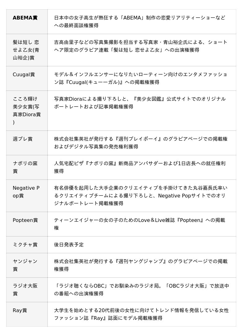 また、毎回話題となる企業賞の第一弾も発表。ラジオ番組への出演や人気雑誌への掲載権など受賞後すぐに活躍できるチャンスを数多くご用意し、芸能界や女優に憧れる全国の女の子を応援します。企業賞は今後も順次追加予定につき、公式SNS等にて決定次第発表いたします。