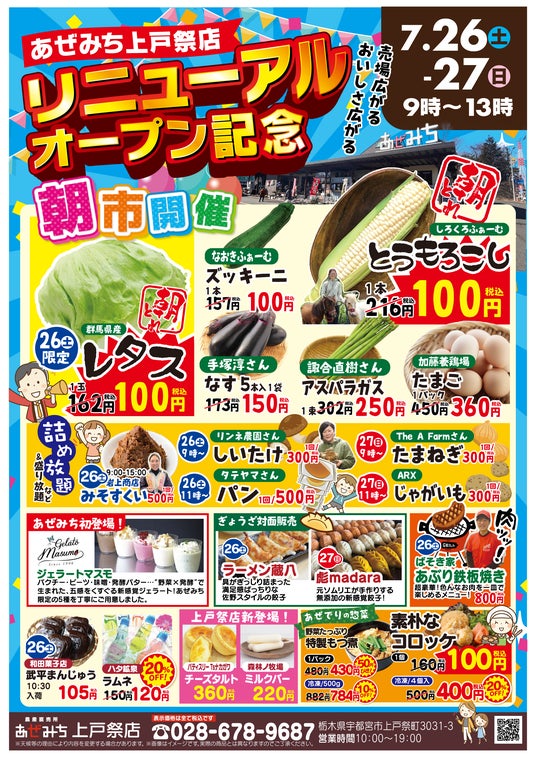 これに合わせて、7月26日(土)・27日(日)にはリニューアル記念イベント「朝市」を開催。朝採れ野菜や地元の名産品など、多くの商品を揃え、地域の皆さまをお迎えします。