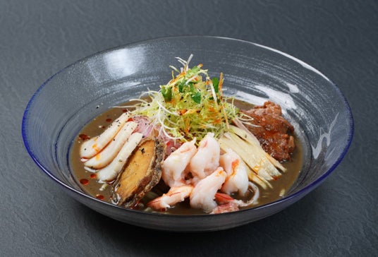 『ブラック冷やし担々麺』(¥4,500)の“ブラックスープ”は、濃厚でありながら辛味のアクセントとなる山椒ですっきりとした味わいに仕上げました。海老やタイラ貝など、トッピングには豪華シーフードが盛り付けられた一皿。
