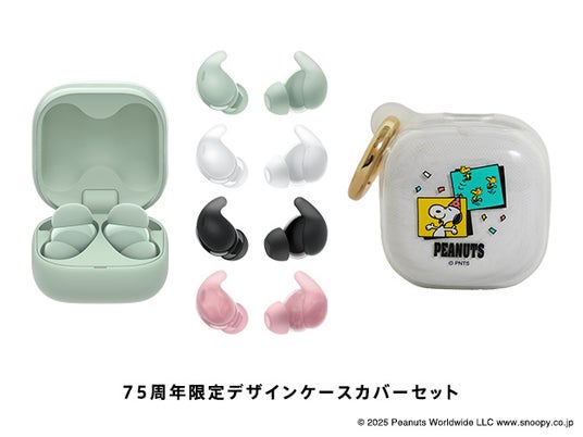 『LinkBuds Fit』の本体(ブラック、ホワイト、グリーン、ピンク)と、オリジナルケースカバーのセットとなります。オリジナルケースカバーの上面部にはスヌーピーとウッドストックをプリントします。下面部にはコミック誕生75周年ロゴをプリントします。プリントのデザインは1種類です。ヘッドホン本体へのデザイン刻印や、プリントはありません。