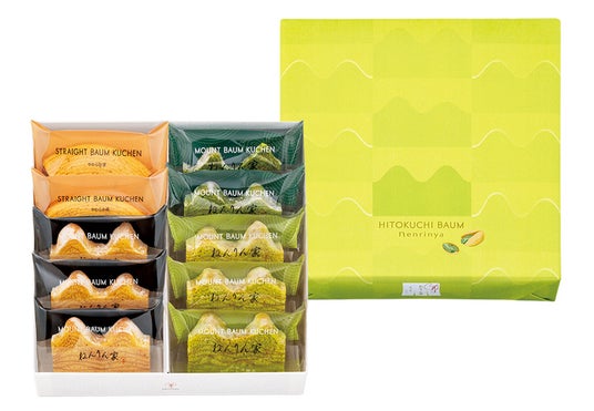 4種の美味しさを楽しめるひとくちサイズのバームクーヘン詰合せです。2つの代表作『マウントバーム しっかり芽』『ストレートバーム やわらか芽』、最新作『ピスタチオ香るマウントバーム』、芳醇宇治抹茶香る『マウントバーム お抹茶』。