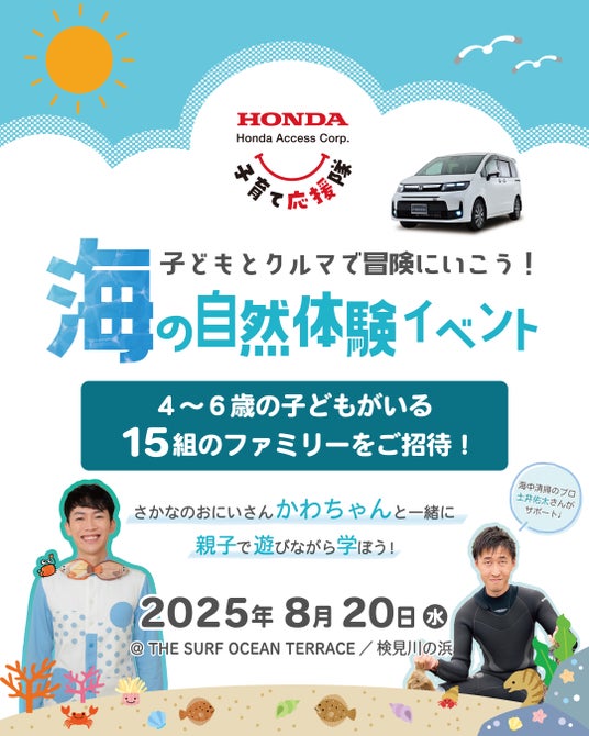 株式会社ホンダアクセスは、2025年8月20日(水)に子育て期の親子向けに自然の体験とパパママを応援するHonda純正アクセサリー装着車の体感ができる「ホンダアクセス子育て応援隊 海の自然体験イベント」をTHE SURF OCEAN TERRACE(千葉県千葉市美浜区)にて開催します。