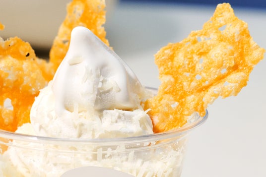 北海道産のクリームを使用したミルク感たっぷりのソフトクリームに、コクのあるチェダーチーズをカリっと焼き上げてトッピングしました。さらに、しっとりとした優しい風味のグラナチーズをふわっと削りトッピング。食感も楽しく、見た目も華やかに仕上げました。ミルキーな甘さとチーズの塩気で飽きのこない味わいをお楽しみいただけます。