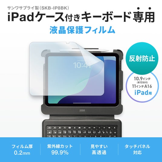 サンワサプライ株式会社(本社:岡山市北区田町1-10-1、代表取締役社長 山田和範)は、iPad 第10世代・A16専用ケース付き一体型キーボード「SKB-IP8BK」専用の保護フィルム「LCD-GGSKBIP8」を発売しました。