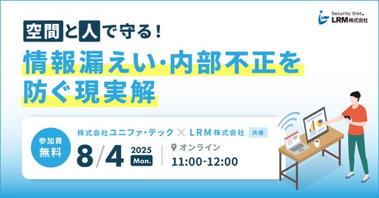 LRM株式会社(本社:兵庫県神戸市、代表取締役CEO:幸松哲也)、株式会社ユニファ・テック(本社:千葉県市川市、代表取締役CEO兼CTO:神崎 康治)は、2025年8月4日(月)11時から、“空間”と“人”で守る!情報漏えい・内部不正を防ぐ現実解について解説するセミナーを無料開催します。