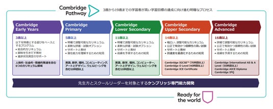 「ケンブリッジ国際教育課程(Cambridge Pathway)」は、3歳から19歳までの児童・生徒を対象とする5段階の教育プロセスです。ケンブリッジ国際教育課程の児童・生徒には、学校や大学、さらには卒業後に必要な知識やスキルを身につけることができます。※「ケンブリッジ国際認定校」はこれらの教育カリキュラムを提供する教育機関で、約160か国、1万校が認定を受けています。