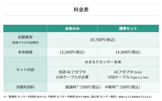 1世帯当たり月額利用料550円で利用可能。専門知識不要ですぐに導入できる見守りサービスです。
