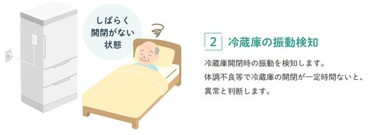高齢者宅の冷蔵庫にセンサーを設置し、体調不良等で冷蔵庫の開閉が一定時間ないと、異常と判断し、法人にメールで通知されます。