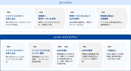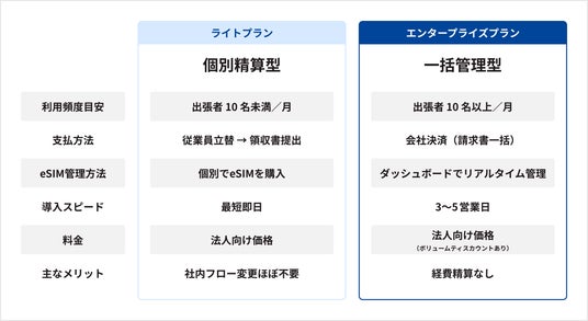 - エンタープライズプラン(一括管理型):会社でeSIMを管理画面上で一括管理し、請求書での支払い