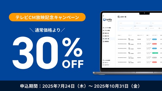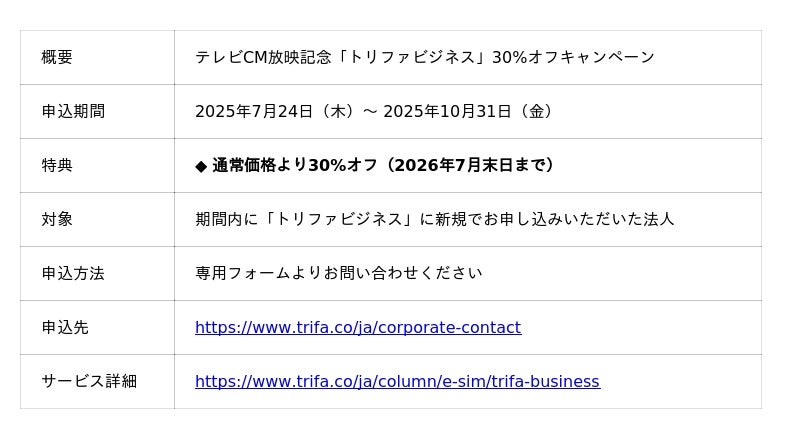 株式会社トリファ(本社:東京都品川区、代表取締役:嘉名 雅俊)が提供する海外eSIMアプリ「トリファ」は、法人向けプラン 「トリファビジネス」 において、テレビCMの放映開始を記念した期間限定キャンペーンを本日より開始いたします。