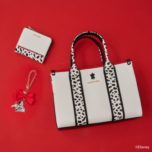ディズニー・アニメーション映画『101匹わんちゃん』に登場する「クルエラ」をイメージしたハンドバッグ、折財布、バッグチャーム。