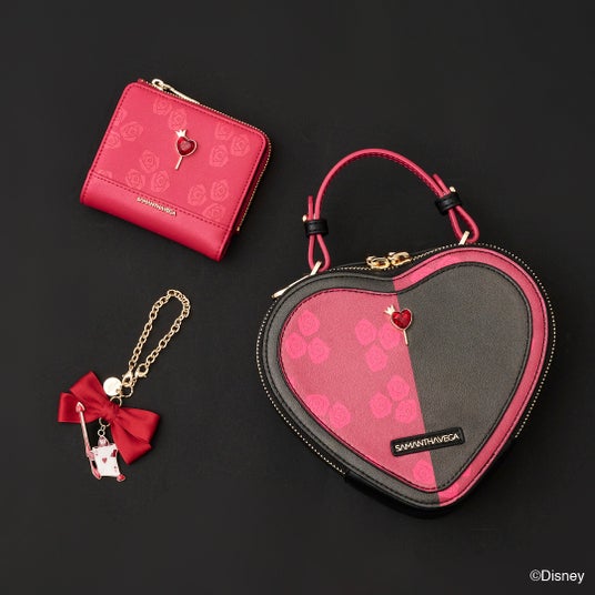 「ハートの女王」をイメージしたショルダーバッグ、折財布、バッグチャーム。