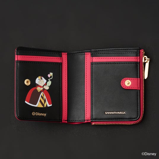折財布の中に「ハートの女王」のアートをプリントし、「ハート女王」を連想させるブラック×レッドのバイカラーで、細部にまで世界観を楽しんで頂けるデザイン。