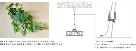 吊るすことを考慮し、アイビー、ポトス、フィロデンドロンなどのツル性観葉植物との相性が良く、自然な光と影が空間をやさしく彩ります。